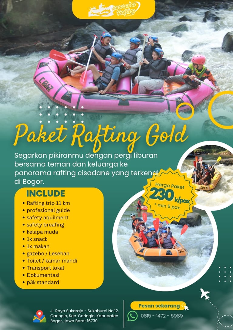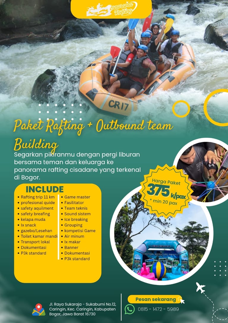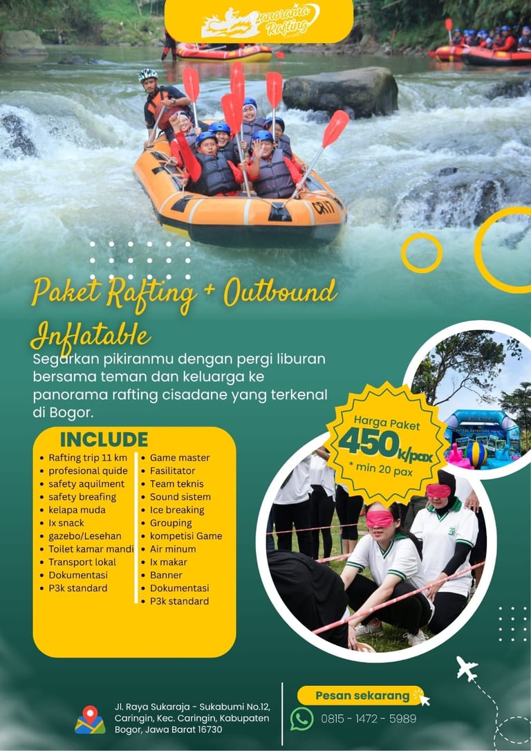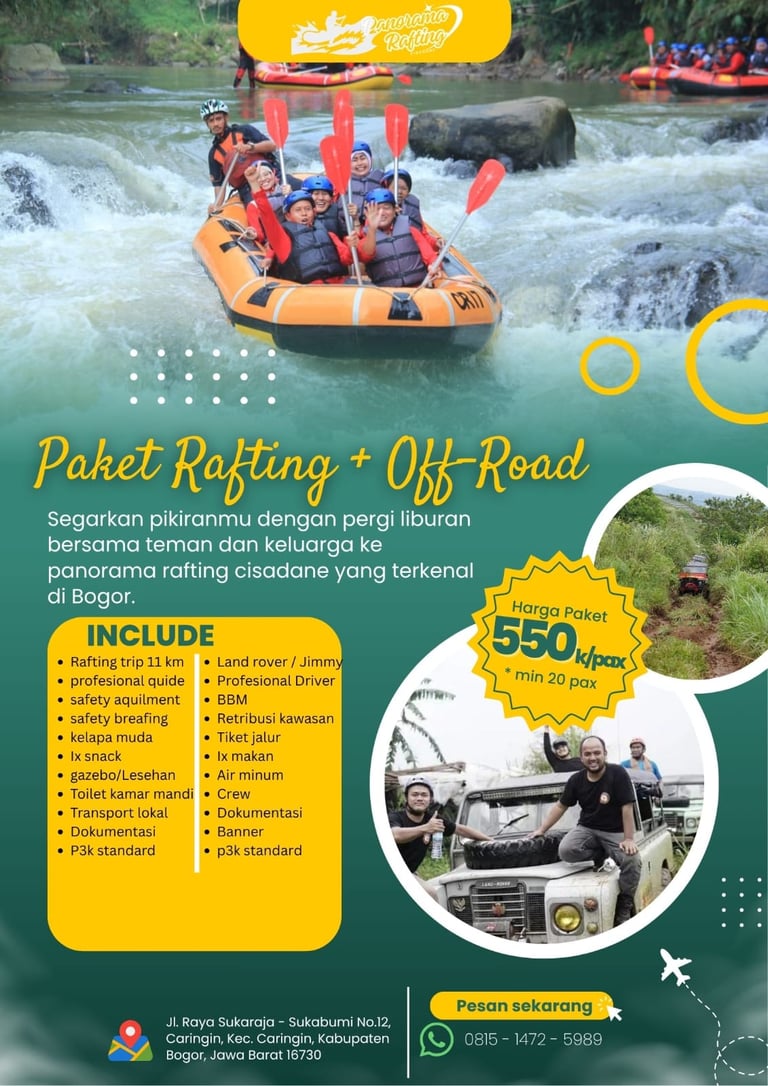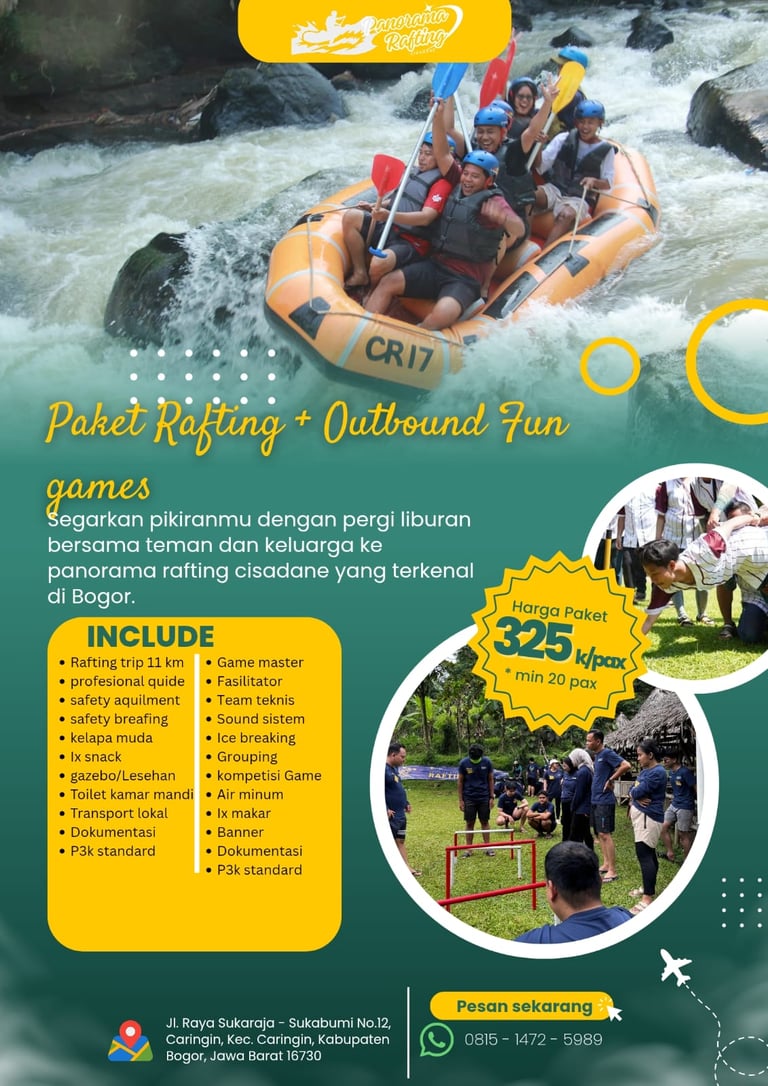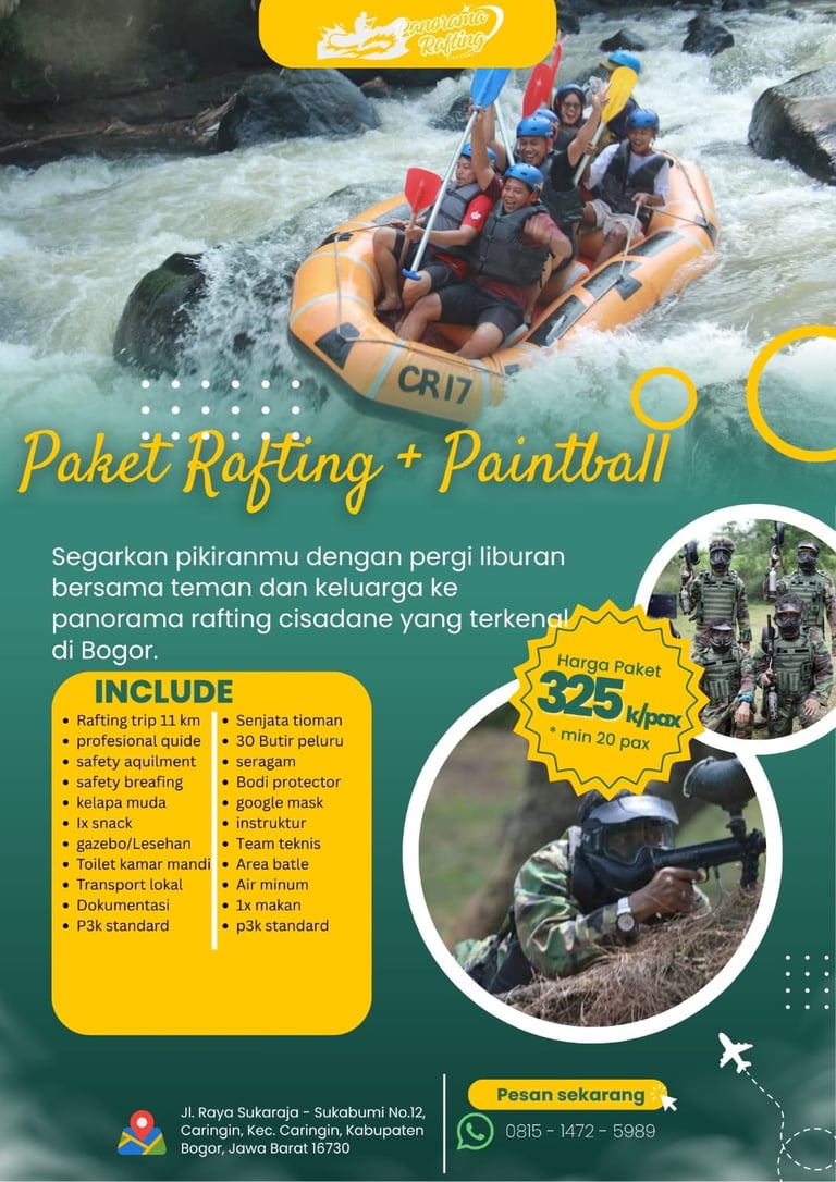 Kami Panorama rafting cisadane siap melayani anda dengan menawarkan berbagai macam paket wisata : Rafting arum jeram, Fun offroad, Fun games, Paintball war, Outbound, Flyfox, Atv race. yang kami kemas secara apik dan profesional agar bisa dirasakan oleh berbagai kalangan mulai dari Instansi, Lembaga & Keluarga, dengan harga terjangkau serta fasilitas terbaik menjamin kegiatan anda akan terasa seru dan tak terlupakan.​