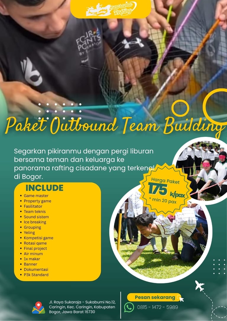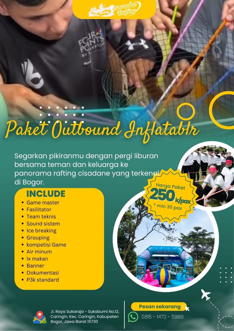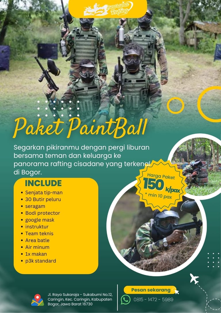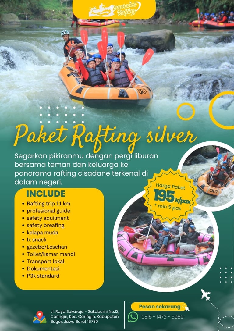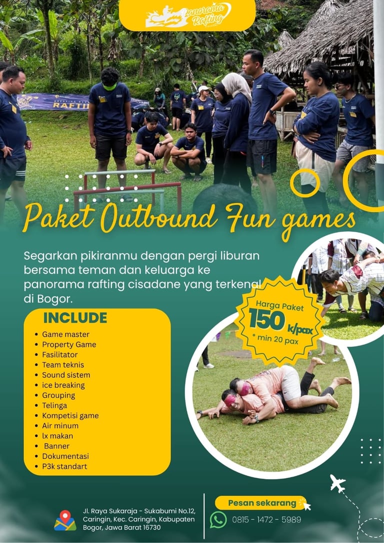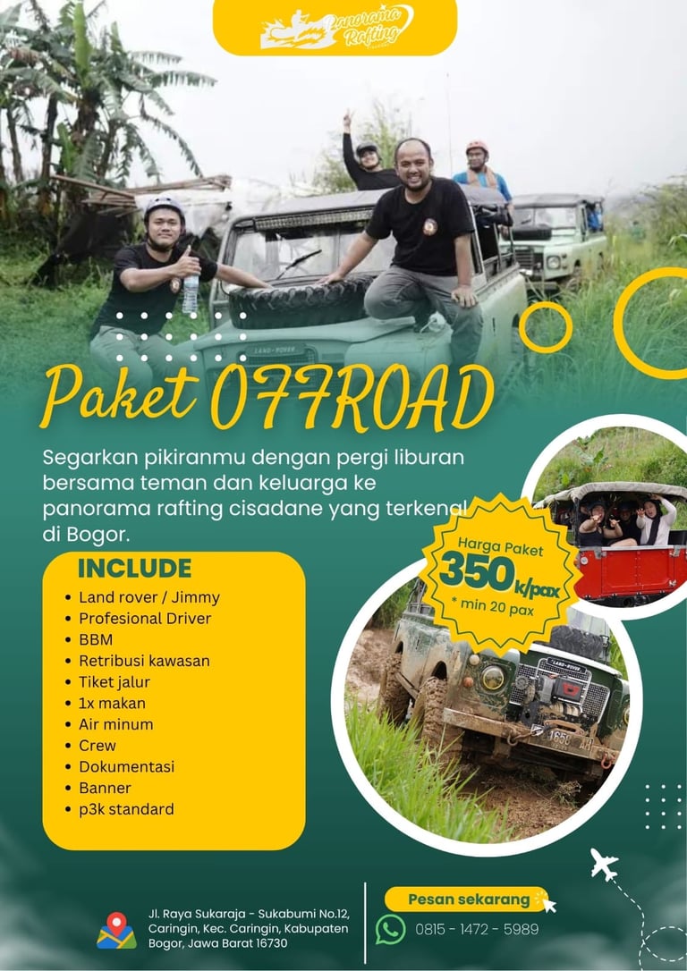 Kami Panorama rafting cisadane siap melayani anda dengan menawarkan berbagai macam paket wisata : Rafting arum jeram, Fun offroad, Fun games, Paintball war, Outbound, Flyfox, Atv race. yang kami kemas secara apik dan profesional agar bisa dirasakan oleh berbagai kalangan mulai dari Instansi, Lembaga & Keluarga, dengan harga terjangkau serta fasilitas terbaik menjamin kegiatan anda akan terasa seru dan tak terlupakan.​